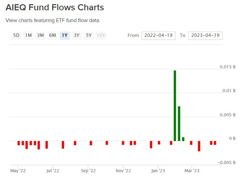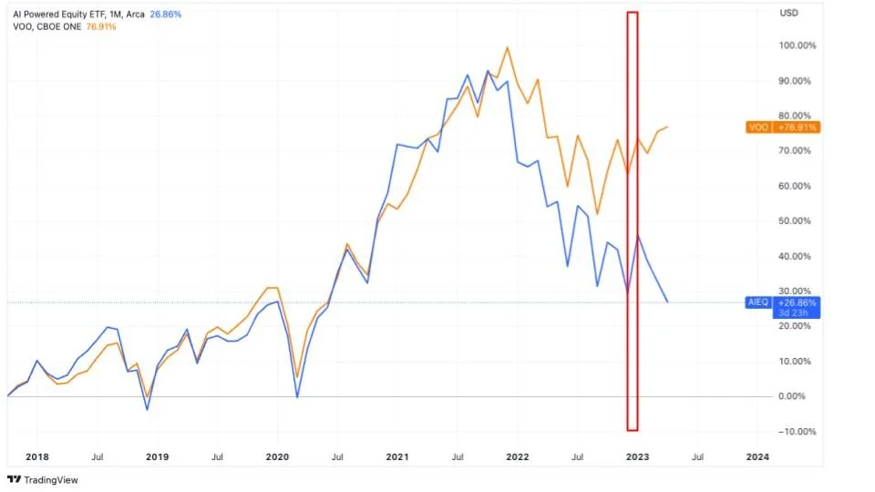 Since inception on October 17, 2017 through April 21, 2023, AIEQ returned just 26.86% versus 76.91% from the Vanguard 500 Index Fund ETF (VOO) return.
